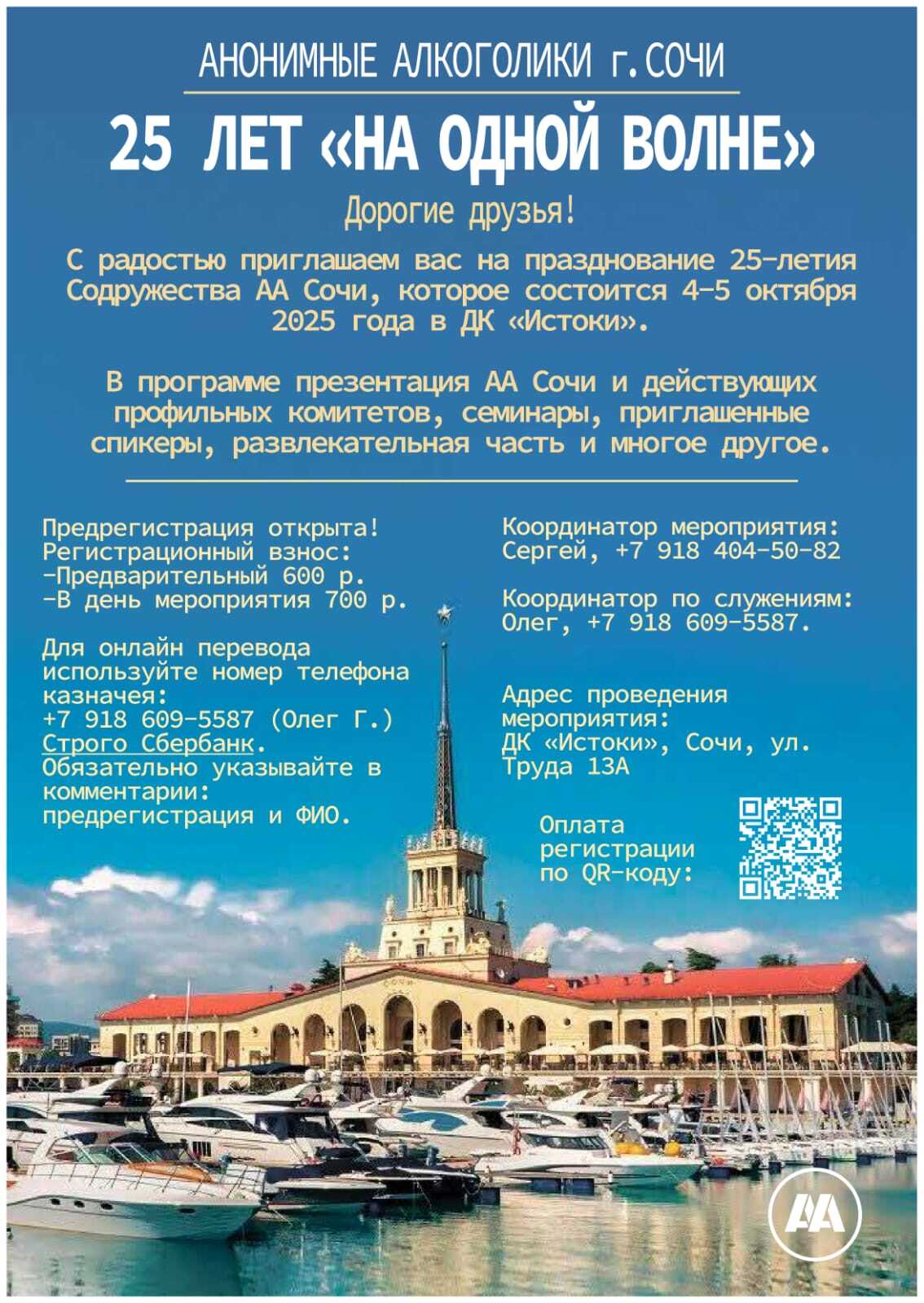 В 2025 году содружество Анонимных Алкоголиков Сочи празднует своё 25-летие — четверть века поддержки, роста и совместного выздоровления для жителей и гостей города Сочи.